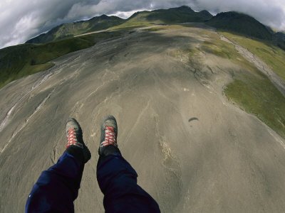 - Photographic Print Title: Motorized Paraglider over a Broad Outwash Plain Between Volcanoes near Klyuchevskoy